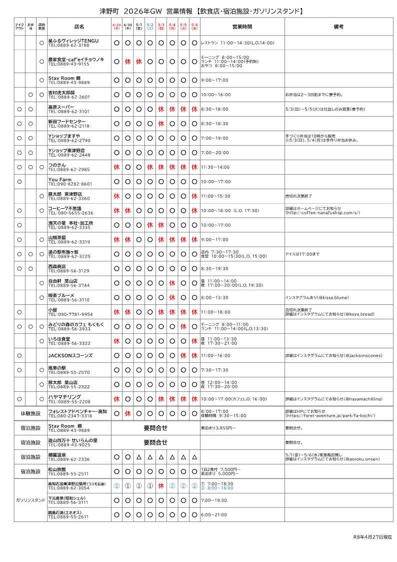 連休中は、営業日や営業時間が異なる場合がございますので津野町内のガソリンスタンドや飲食店等の営業情報についてご案内いたします。